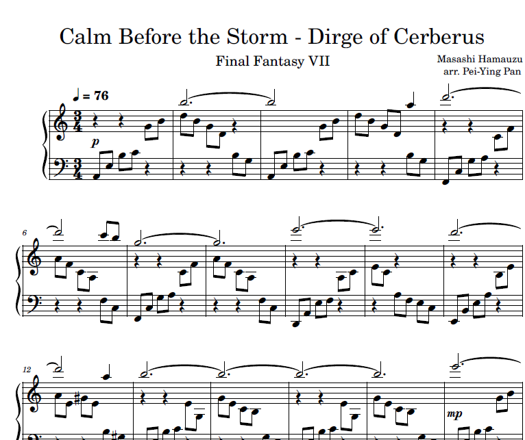 Intermediate arrangement of Calm Before the Storm - Dirge of Cerberus from FF7, around grade 5-6 level.