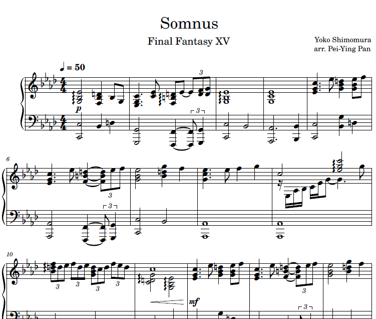Intermediate-advance piano cover for FF15, Somnus, around grade 7-8 level.